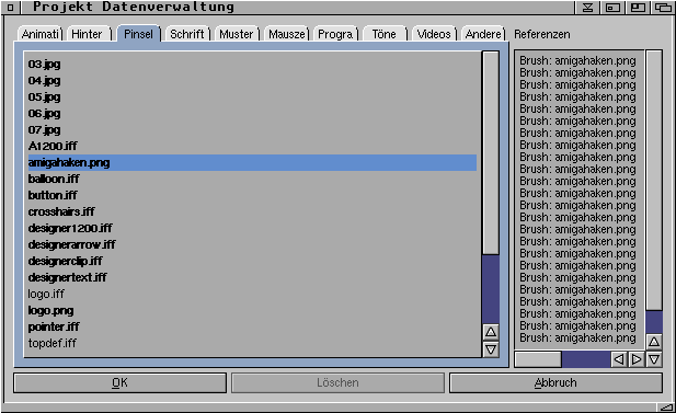 Mit Hilfe von diesem Dialog können Sie die externen Daten, die Ihr Projekt benutzt verwalten. Das Dialogfeld besteht aus zehn Seiten: Animationen, Hintergründe, Mauszeiger, Pinsel, Schriften, Muster, Programme, Töne, Videos und andere Dateien. Auf jeder Seite bekommen Sie in einer Liste die Dateien angezeigt, die sich im entsprechenden Unterverzeichnis in Ihrem Projektverzeichnis befinden. Eine Ausnahme stellt die Seite "Andere" mit den weiteren Dateien dar: Hier werden Dateien gelistet, die sich in nicht standardgemäßen Verzeichnissen befinden. Dabei werden die Dateien, die Sie auch tatsächlich in Ihrem Projekt benutzen, weiß hervorgehoben.