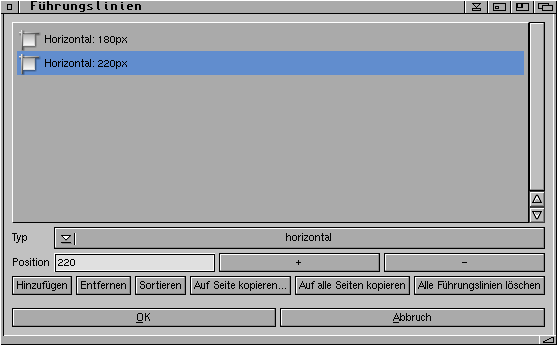 In diesem Dialog können Sie Führungslinien (Hilfslinien) hinzufügen oder entfernen. Diese können verwendet werden, um Objekte bequem auszurichten und konsistente Layouts zu erstellen. Der Dialog sieht folgendermaßen aus: