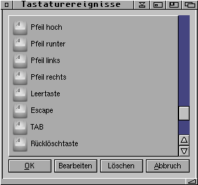 Dieser Dialog kann dazu benutzt werden, Tastaturereignisse für die aktuelle Seite zu konfigurieren. Immer wenn eine Taste gedrückt oder losgelassen wird, werden die in diesem Dialog konfigurierten Aktionsereignisse vom Hollywood Designer ausgeführt. Bei Tastatur-Ereignissen wird zwischen zwei Typen unterschieden: 'Wenn Taste gedrückt' und 'Wenn Taste losgelassen'. Die Aktionsereignisse für den Typ 'Wenn Taste gedrückt' werden ausgeführt sobald der Benutzer die jeweilige Taste drückt und die Ereignisse des Typs 'Wenn Taste losgelassen' werden gestartet, wenn der Benutzer die jeweilige Taste wieder loslässt.