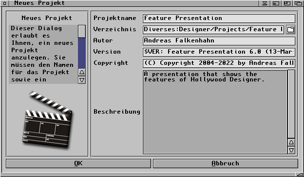 Im Neues Projekt-Dialog können Sie einige Informationen über Ihr Projekt eintragen. Name, Verzeichnis, Autor, Version, Copyright und Beschreibung können eingegeben werden. Alle Einträge sind optional mit Ausnahme des Namens und des Verzeichnisses. Diese beiden Angaben müssen gemacht werden. Wenn das angegebene Verzeichnis noch nicht existiert, wird es vom Hollywood Designer angelegt.