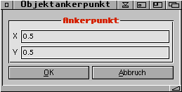 Dieser Dialog kann benutzt werden, um den Ankerpunkt eines Objekts zu verändern. Der Ankerpunkt ist der Punkt innerhalb eines Objekts, der als Ursprung für alle Objekttransformationen (Skalierung, Drehen) benutzt wird. Außerdem sind alle Positionsangaben für das Objekt relativ zum Ankerpunkt. Manchmal wird der Ankerpunkt auch als "Hot Spot" eines Objekts bezeichnet.