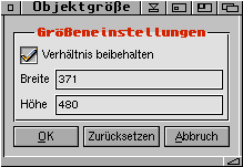 In diesem Dialogfenster können Sie die Größe eines Objekts ändern. Dies ist momentan nicht für Textobjekte möglich. Wenn Sie Textobjekte vergrößern oder verkleinern möchten, ziehen Sie einfach im Layoutdialog auf die gewünschte Größe.