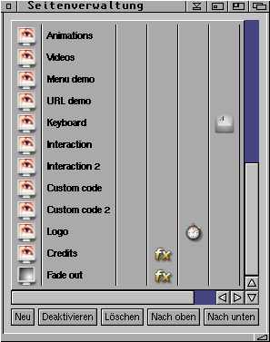 Die Seitenverwaltung ist in sechs Spalten unterteilt: In der ersten Spalte befindet sich ein Piktogramm, welches den Seitentyp symbolisiert. Ein Monitor mit Auge steht für den Seitentyp "Bild", ein Monitor mit mehreren Farben steht für den Seitentyp "Farbverlauf", ein Monitor mit blauem Hintergrund steht für den Seitentyp "Leer" und ein Monitor mit Schachbrett-Muster steht für den Seitentyp "Muster". Wenn Sie einen Doppelklick auf die erste Spalte machen, werden die Eigenschaften der Seite aufgerufen.