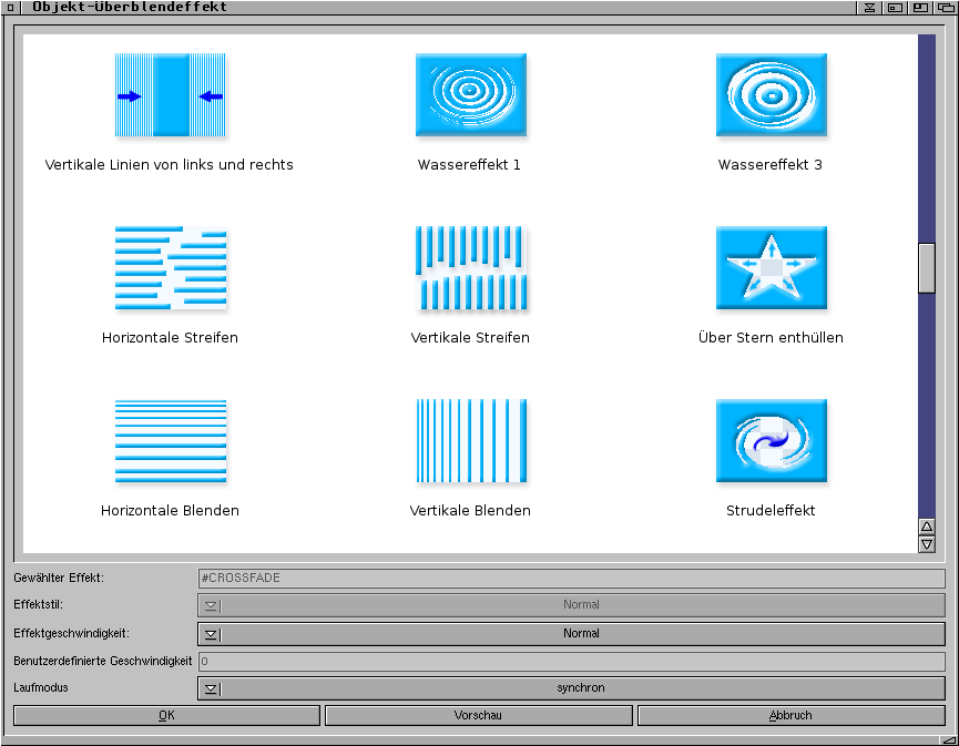 Im Überblendeffekt-Dialog können Sie einen Überblendeffekt für Ihr Objekt oder Ihre Seite auswählen sowie die Geschwindigkeit und einige zusätzliche Parameter des Effekts bestimmen. Um einen Effekt auszuwählen, klicken Sie einfach mit der linken Maustaste auf sein Symbol.