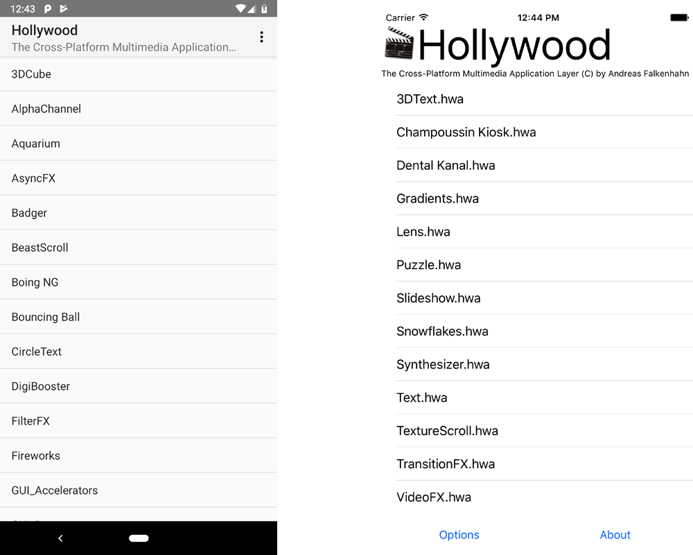 Hollywood ist auch als Nur-Player-Version für Android und iOS verfügbar, die es Ihnen erlauben, Ihre Hollywood-Applets auf Smartphones und Tablets auszuführen. Der Hollywood-Player für Android benötigt mindestens Android 4.0 und ist bei Google Play unter dieser URL frei verfügbar: http://play.google.com/store/apps/details?id=com.airsoftsoftwair.hollywood. Leider ist der Hollywood-Player für iOS derzeit nicht im App Store verfügbar, da seine Möglichkeiten mit den App Store-Regeln von Apple in Konflikt geraten.