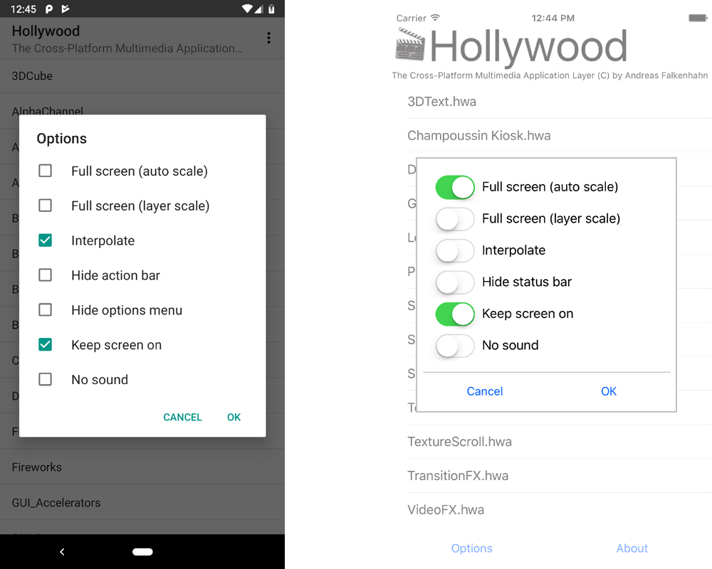Hier sind Screenshots des Hollywood-Players für Android (links) und iOS (rechts):