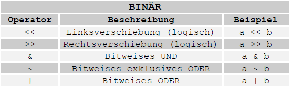 -Operatoren mit dem Unterschied, dass &, ~ und | auf Bit Ebene