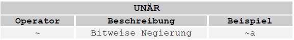Der unäre Negation-Operator (~) wird eine bitweise Inversion auf die Zahl verwenden. Alle Bits werden invertiert. Bitte beachten Sie, dass der Wert immer vor der Inversion in ein 32-Bit Ganzzahl umgewandelt wird. So könnte man eine Menge von führenden Einsen bekommen. Beispielsweise: