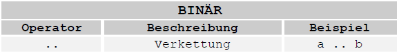 Der Zeichenketten-Verkettungsoperator kann verwendet werden, um zwei Zeichenketten in eine neue zu verketten. Weil Hollywood automatische Zeichen- und Zahlenumwandlung bietet, können Sie sogar zwei Nummern verketten. Das Ergebnis wird aber immer eine Zeichenkette sein. Beispiele: