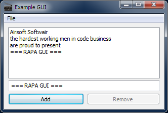 Willkommen zum RapaGUI-Tutorial! Dieses kleine Schritt-für-Schritt-Dokument führt Sie in wenigen Schritten durch den Prozess der Erstellung Ihrer ersten GUI mit RapaGUI. Wir werden eine kleines GUI-Programm erstellen, welches aus einer Listenansicht, einem Texteingabe-Widget und zwei Schaltflächen besteht (Listview, Textentry, Button). Die beiden Schaltflächen sollten so programmiert werden, dass sie das Hinzufügen und Entfernen von Einträgen aus der Listenansicht ermöglichen. Die Daten, die in die Listenansicht eingefügt werden sollen, sind dem Texteingabe-Widget zu entnehmen. So sieht dieses kleine Programm unter Windows aus: